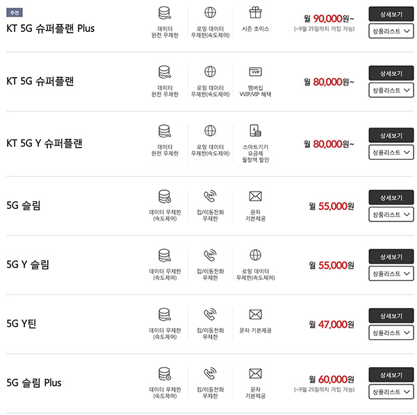 각 요금제는 선택에 따라 부가서비스및 멤버십 서비스가 차등화되며 차이가 있습니다. 그러니까 평소 사용습관이나 내게 맞는 부가 서비스를 선택해서 고르는 것이 좋습니다. 참고로 한시적으로 가입할 수 있는 요금제도 있는데 kt 5G 슈퍼플랜 Plus와 5G 슬림 Plus는 9월 25일까지 가입이 가능합니다.