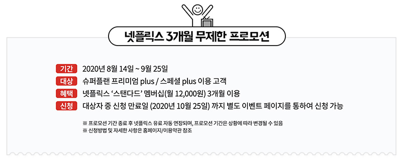 참고로 슈퍼플랜 프리미엄 plus나 스페셜 plus에 가입하면 넷플릭스 스탠다드 멤버십 3개월 이용이 가능합니다. 현재 이 이벤트는 9월 25일 까지 가입해야 신청할 수 있습니다.