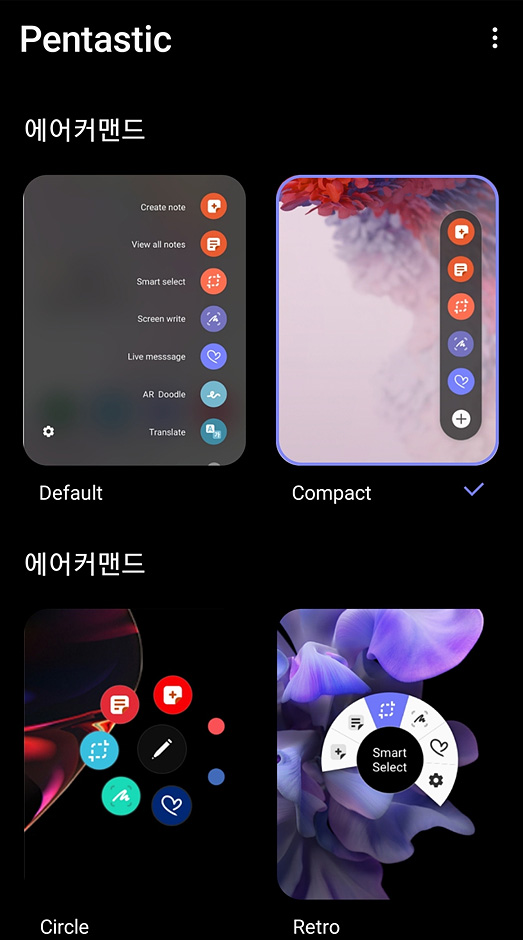 굿락 Pentastic 모듈은 갤럭시 노트20 위 이미지에 보이듯 기본으로 사용하는 에어커맨드 외에도 사이클, 콤팩트, 레트로 등 다양한 에어커맨드를 제공하고 있습니다.