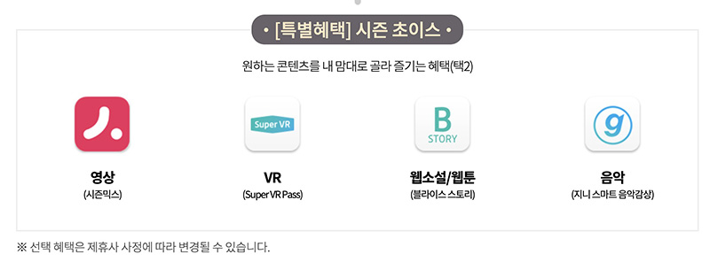 그리고 프리미엄 요금제에서 시즌 초이스의 경우는 혜택 2가지를 선택 할 수 있는데 제경우 시즌과 함께 지니 뮤직을 사용하고 있습니다.