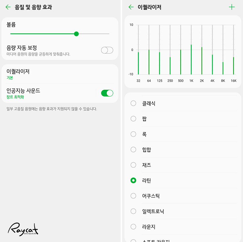 인공지능 사운드가 적용되어 장르에 맞춰 자동으로 음장 효과를 조절하게 되며 영화나 게임을 플레이 할 때 자동으로 적용됩니다. 그리고 이퀼라이저 기능으로 직접 취향에 맞는 소리를 찾아보는 것도 재미있을 수 있습니다.