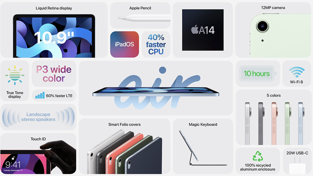 다음달 출시 예정으로 현재 구매는 가능하지 않지만 아이패드 에어 4세대의 경우 상당히 많은 부분이 업그레이드 되어 기존에 아이패드 프로 11형이 부럽지 않을 정도로 많은 부분이 바뀌었습니다.