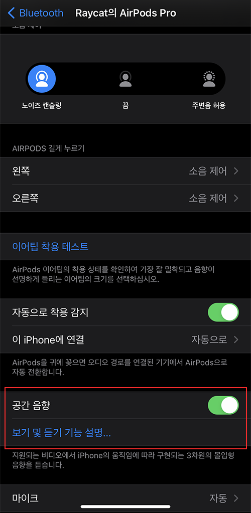 ios14에서 에어팟 프로의 펌웨어를 업데이트 해야 공간 음향을 사용할 수 있는데 ios14 업데이트 후 설정 -> 블루투스 -> 에어팟프로 선택후 에어팟 프로 설정 화면을 보면 공간 음향이 추가된 것을 볼 수 있습니다.