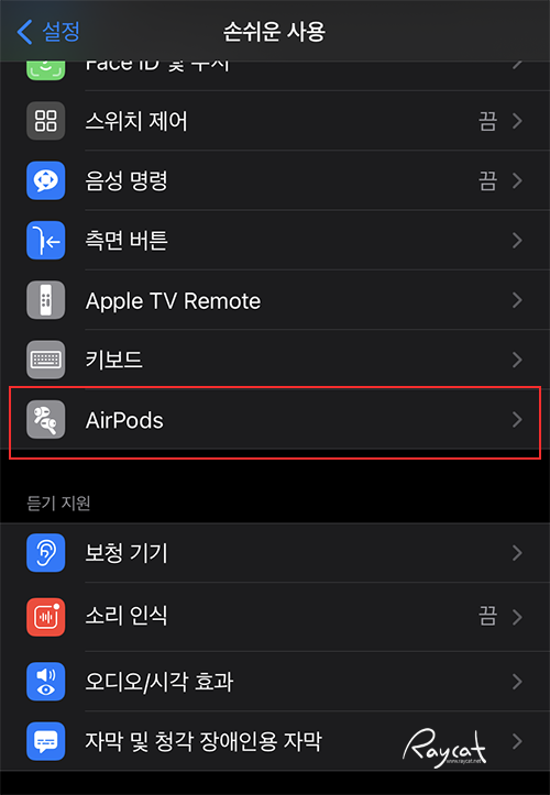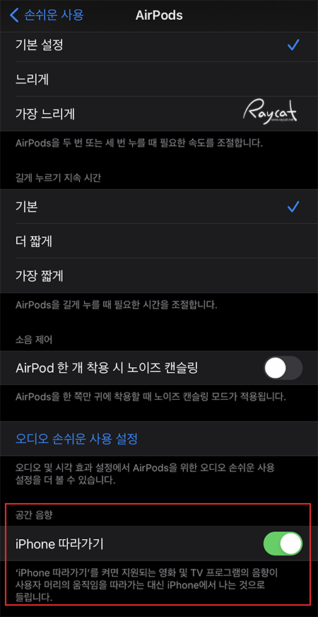 설정 블루투스에서 에어팟 프로, 공간 음향을 ON 했다면 다시 설정 -> 손쉬운 사용 -> AirPods 메뉴로 들어가 아이폰 따라가기를 ON 하면 공간 음향을 사용할 준비가 끝납니다.