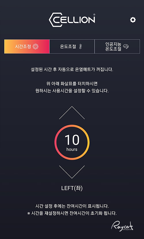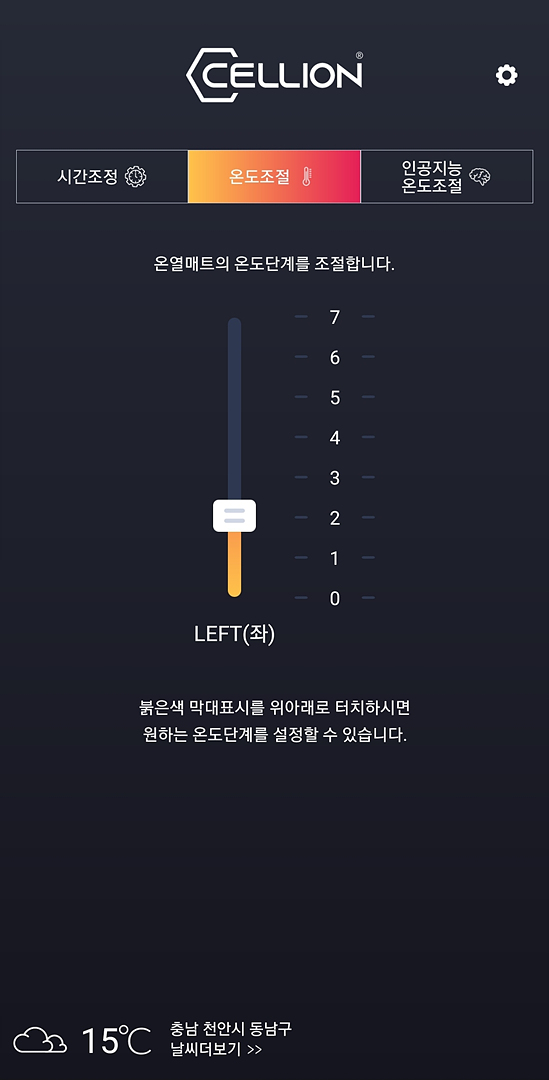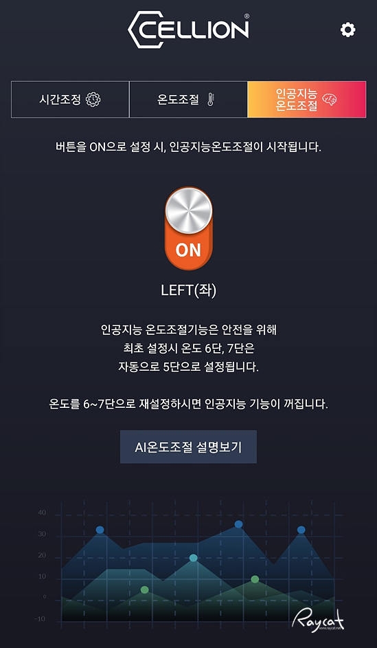그리고 스마트폰으로 연결 특별한 기능으로 앱에서 인공지능 온도조절을 켜두면 기상청및 지역 날씨 기준으로 셀리온 온열매트의 온도를 자동으로 최적화하여 조절 됩니다. 단 인공지능 온도조절은 앱에서 온도를 6~7단으로 올리면 자동으로 해제되며 사용자가 맞춰둔 온도에서 10~30% 내 변경이 됩니다.