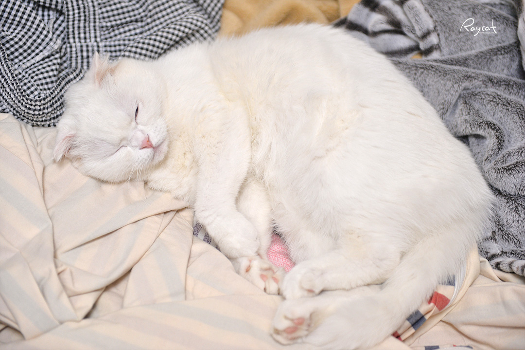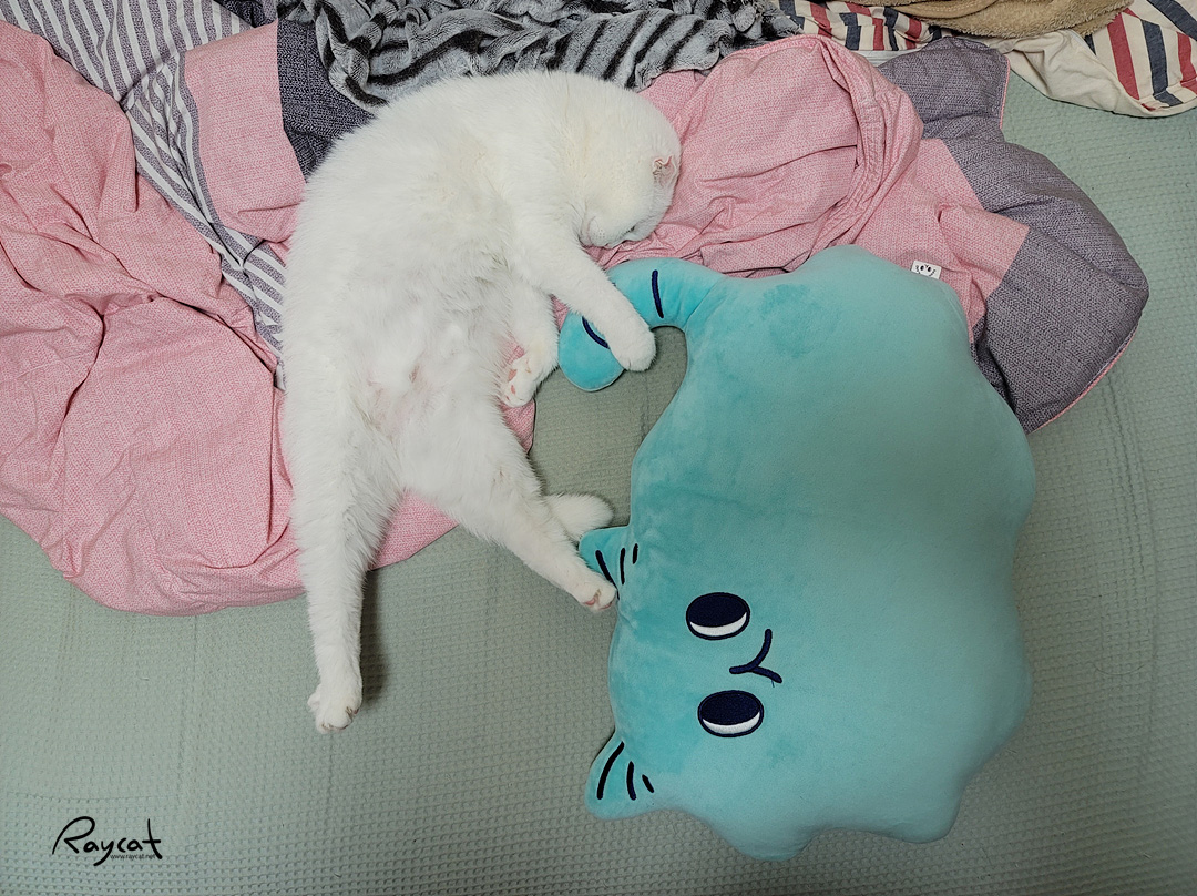이불을 저녁에 정리해놔도 침대에 사람이 눕기전까지 이불을 헤집고 다녀서 그런지 일을 하다가 나중에 보면 이불을 한쪽에 몰아넣고 퍼질러 자고 있다. 그리고 고양이라 그런지 고양이 인형도 좋아한다.