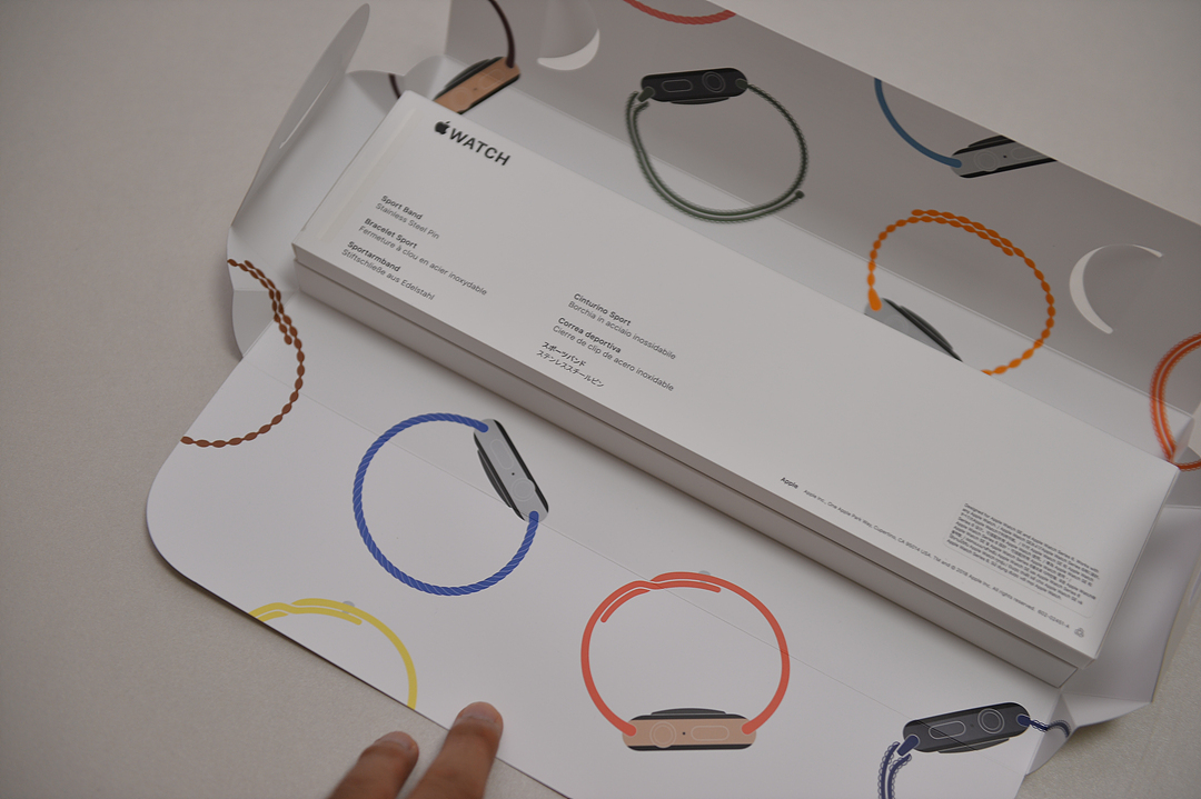패키지 포장은 애플의 감성이라고 할까요? 패키지 포장은 이전 애플워치 시리즈와 큰 차이는 없습니다. 박스를 열면 안쪽에 애플워치의 다양한 스트랩이 그림으로 그려져 있습니다.