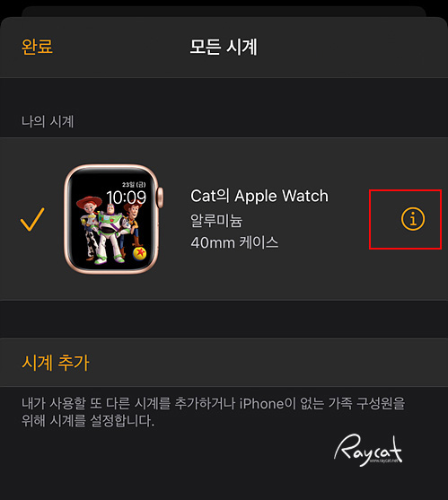 보통 연결된 애플워치가 하나기 때문에 위 화면에서 애플워치를 선택 느낌표 아이콘을 누르면 나의 애플워치 찾기 그리고 애플워치 연결 해제 메뉴가 보입니다.