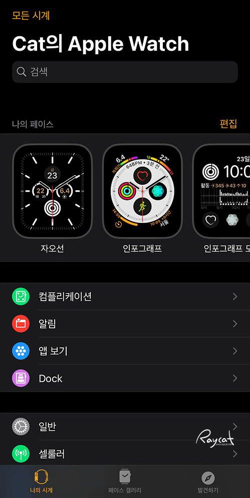 아이폰에서 애플워치 선택 애플워치 설정 화면으로 들어갑니다. 거기서 나의 애플워치를 선택하면 아래 캡처와 같은 화면을 볼 수 있습니다.