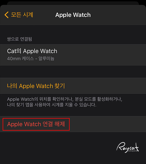 보통 연결된 애플워치가 하나기 때문에 위 화면에서 애플워치를 선택 느낌표 아이콘을 누르면 나의 애플워치 찾기 그리고 애플워치 연결 해제 메뉴가 보입니다.