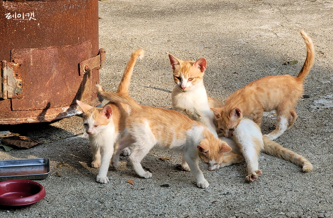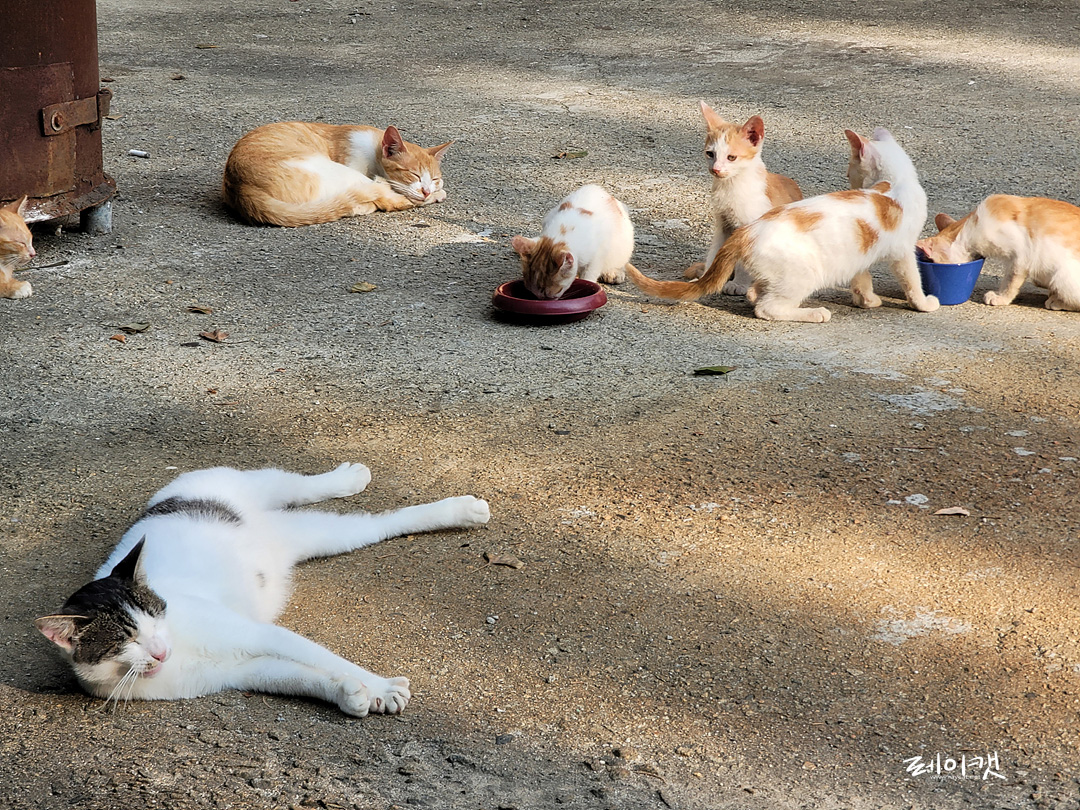 어미들은 원래 사람을 별로 겁내지 않았는데 새끼 고양이들은 사람이 보이면 숨기 바빴는데 지금은 사람이 나오면 그냥 지켜보는 편이다.