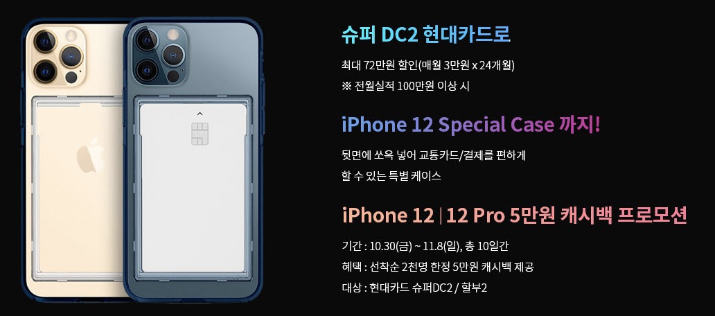 제휴카드 이벤트도 진행 중으로 현대카드 실적에 따라 최대 72만 원 할인(매월 3만 원)이 되며 아이폰 12용 케이스도 제공하고 있습니다. 그리고 선착순 2천 명 한정 5만 원 캐시백도 제공하고 있습니다. (대상 : 현대카드 슈퍼 DC2 / 할부 2)