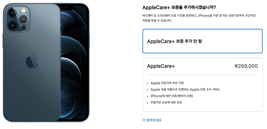KT 애플 케어 팩은 이용료를 월 단위로 지불하기 때문에, 기존의 일시 지불 방식이었던 애플케어보다 최초 부담을 줄일 수 있는 장점이 있습니다. 공식 홈에서 아이폰 12 프로 구입 시 애플케어+를 추가하면 269,000 이란 부담금이 발생 하지만 kt 애플케어 팩은 월정액 2300원으로 최초 부담금을 줄일 수 있습니다.