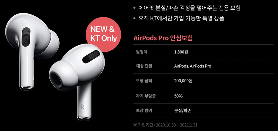 그리고 이번 아이폰12, 아이폰12 프로 출시와 함께 ’에어팟 전용 보험’도 출시 했는데 월 1,800원으로 에어팟 혹은 에어 팟 Pro 분실 및 파손 시 최대 20만 원 보장 & 수리 비용의 50% 자기 부담 서비스를 선보입니다.