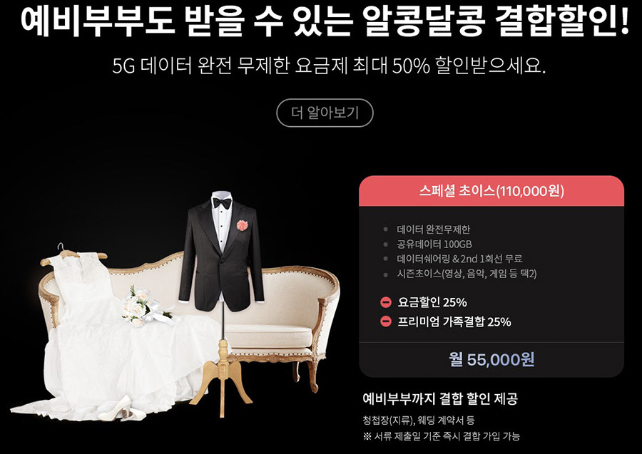 이번 아이폰12 시리즈는 모두 5G 서비스를 지원하고 있기 때문에 완전 무제한 5G 스페셜 초이스 요금제를 기준으로 요금할인 25%, 가족 결합 25%를 더하면 50%까지 할인받을 수 있습니다. 예비부부도 가족 결합 할인을 제공하니 결혼을 앞두고 기변이라면 청첩장 혹은 웨딩 계약서 제출일부터 결합 가입이 가능하니 참고하세요.