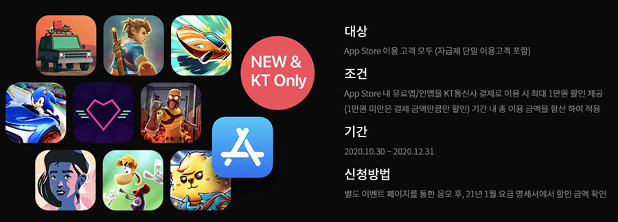 앱스토어 내 유료/인앱 결제 시 kt 통신사 결제로 이용 시 최대 1만 원 할인을 제공합니다. 기간은 2020.10.30. ~ 2020.12.31. 까지 결제한 경우에 해당되며 별도 이벤트 페이지를 통해 응모 후, 21년 1월 요금 명세서에서 할인 금액을 확인할 수 있습니다.