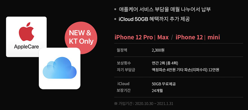 그리고 이번 아이폰 12 출시와 함께 애플과의 제휴를 통해 KT 애플 케어 팩을 출시했습니다.