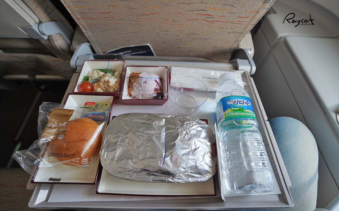 기내식은 역시 비행기 안에서 먹어야 맛있습니다. 아시아나는 쌈밥이 제일 맛있는데 이날은 파스타에 닭가슴살 스테이크, 빵, 생수, 샐러드, 크림 케이크가 나왔습니다.