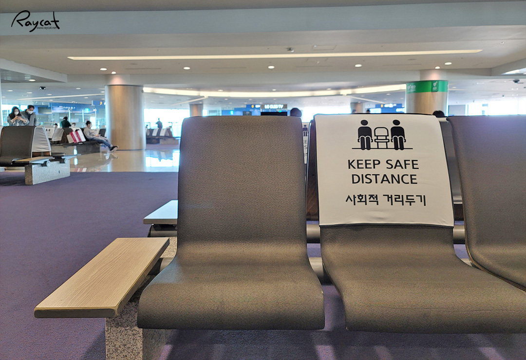 공항에서도 사회적 거리두기를 그래서 의자에 한칸씩 모두 띄워 앉도록 되어 있습니다. 비행기 탑승도 30명씩 나눠서 버스를 타고 탑승장으로 이동 했습니다.