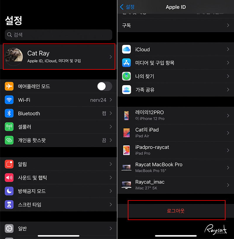 설정에서 계정을 선택하고 로그아웃을 합니다. 로그아웃을 하지 않으면 아이클라우드의 나의 찾기에 보면 내기기로 계속 남아있기 때문에 초기화전 로그아웃을 먼저하고 초기화를 진행해야 합니다.