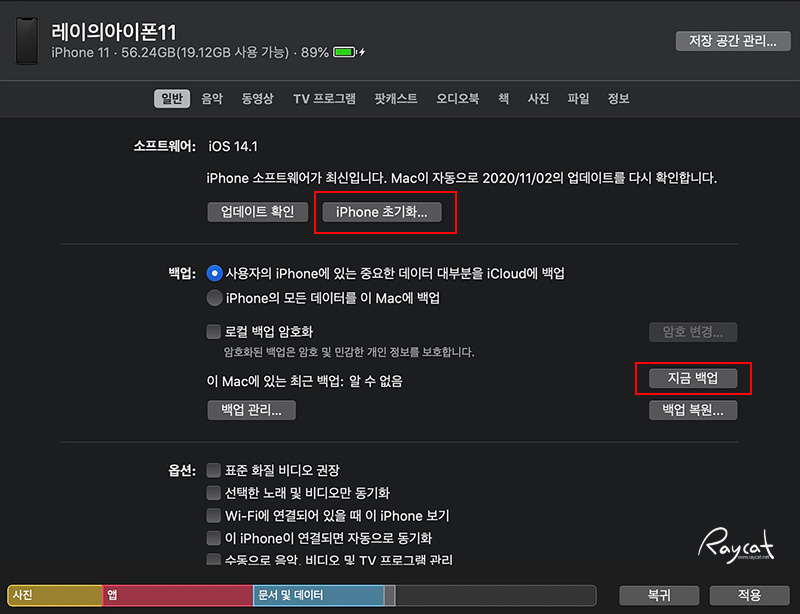 맥에서 데이터를 백업하고 그리고 초기화 할 수 있는데 맥에 라이트닝 케이블로 아이폰을 연결 파인더에서 아이폰을 선택하면 위 캡처화면을 볼 수 있습니다. 필요한 데이터가 있다면 먼저 백업하고 초기화를 진행하면 됩니다.