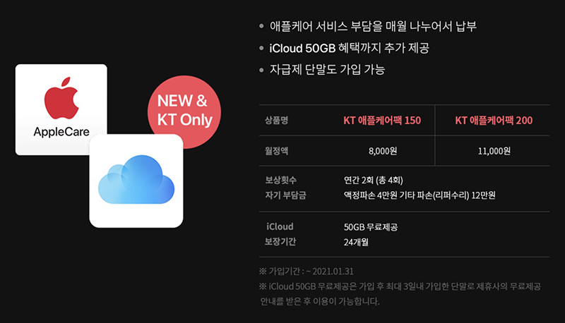 kt 애플케어팩은 애플케어뿐 아니라 iCloud 서비스까지 제공하고 있습니다. 24개월 유지가 됩니다.