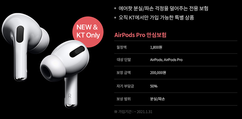 그리고 이번 아이폰12 시리즈는 구성품에서 모두 충전기와 이어폰이 빠졌습니다. 아마 이어폰이 없기 때문에 무선 이어폰으로 에어팟이나 에어팟 프로를 구매하시는 분들도 많을것 같은데 kt에서 에어팟 프로 안심보험도 출시 했습니다.