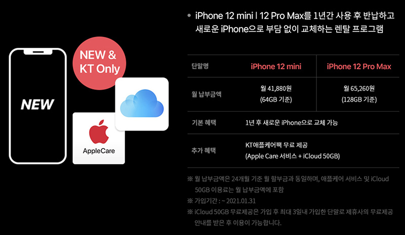 : 아이폰12 미니, 아이폰12 프로 맥스를 1년간 사용 후 반납하고 새로운 아이폰으로 부담없이 교체할 수 있는 휴대폰 렌탈 프로그램