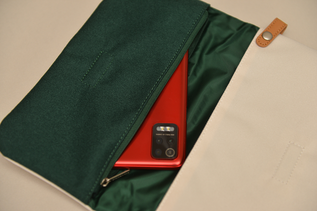 안감은 초록색 입니다. 안감이 좀 연한 파스텔톤 그린 이었으면 더 좋았을것 같은데 좀 튀는 느낌 입니다. 안쪽 포켓은 스마트폰 하나 넣으면 꽉 찹니다.