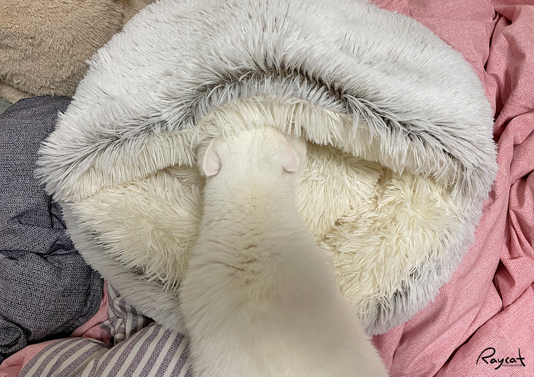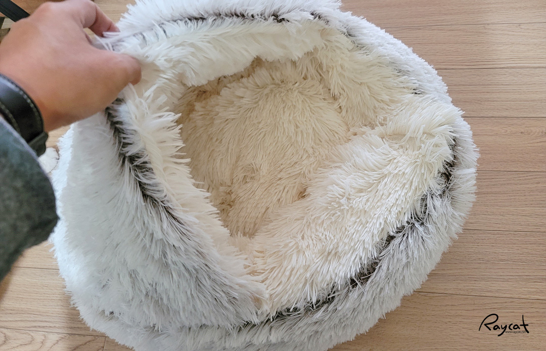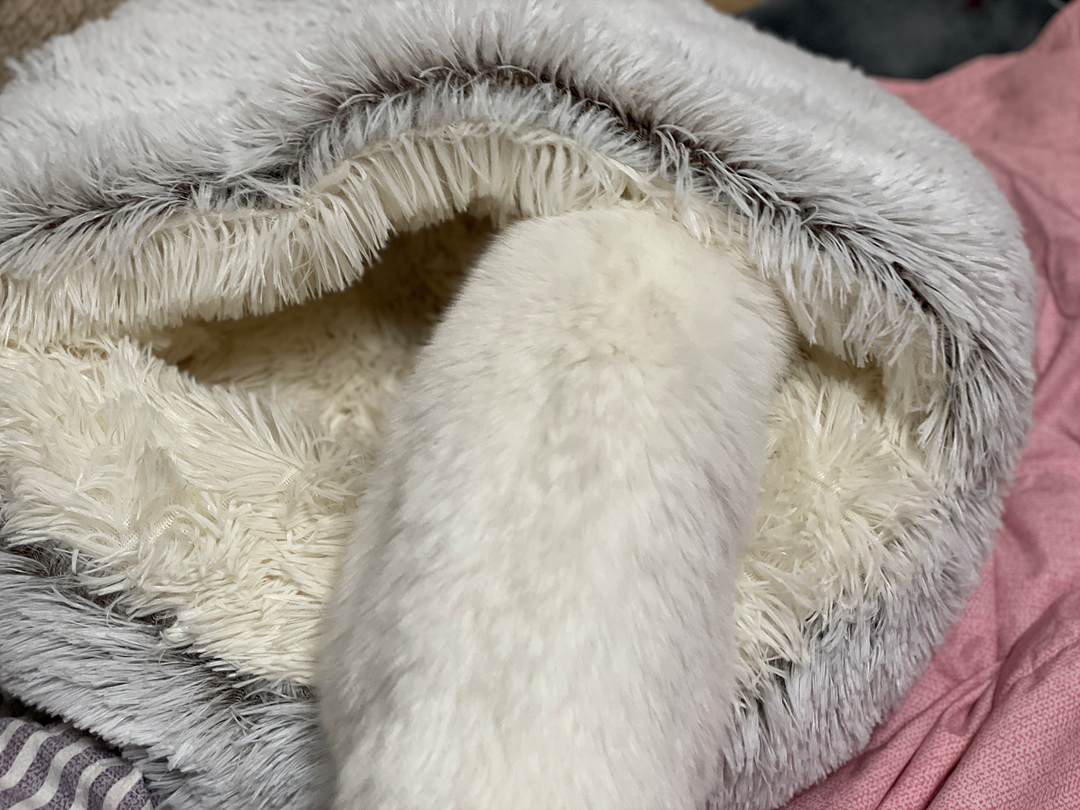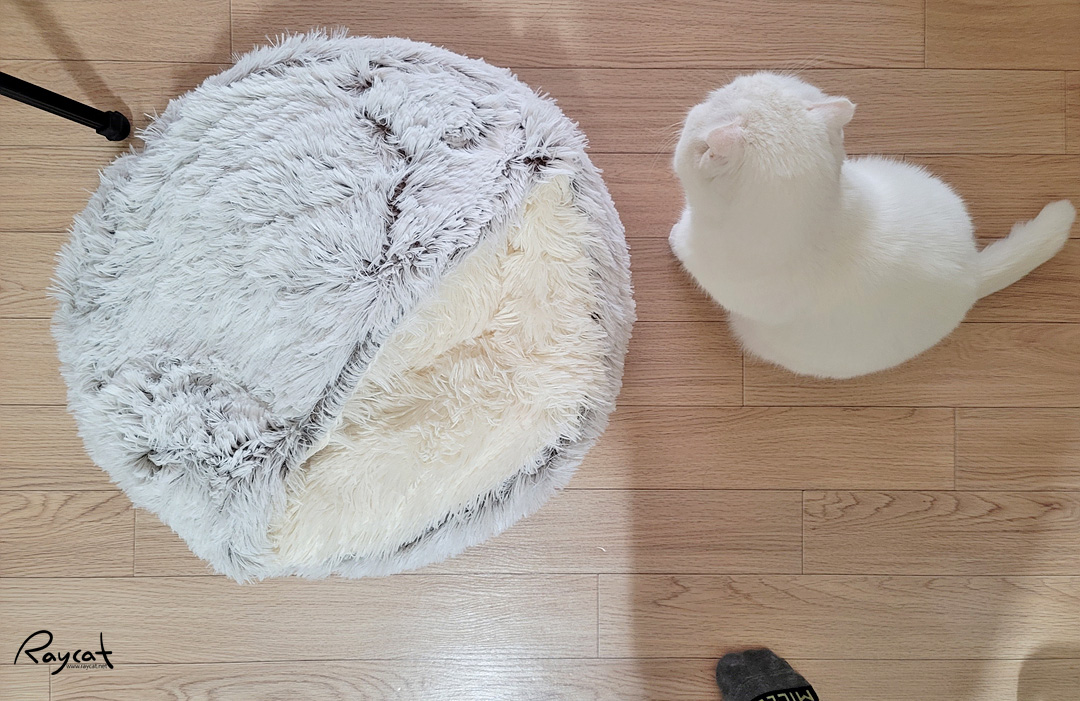 방석 같이도 사용할 수 있고 털도 복실하게 부드럽고 좋은데 매일 머리만 집어넣고 딩굴다 만족하고 정작 잠은 다시 이불 위에서 딩굴며 잔다. 머리가 들어가니까 안으로 들어가서 쉬고 몸을 말아서 쉴 수 있을것 같았는데 매일 머리만 저렇게 집어넣고 있다.