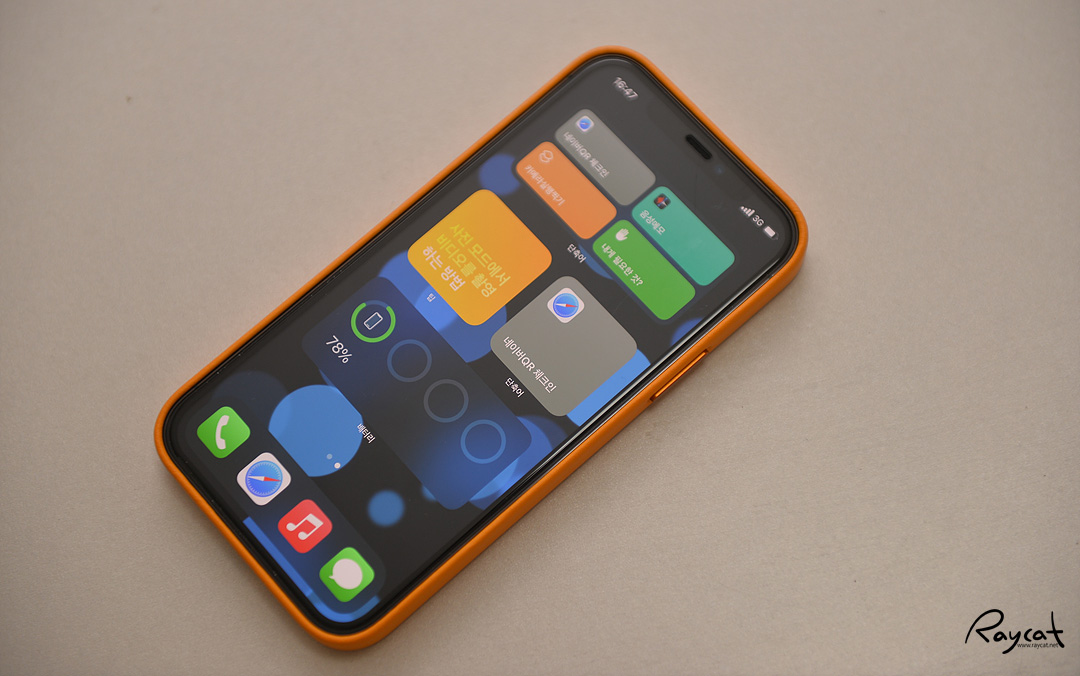 전면 테두리 부분도 살짝 올라와 있어 뒤집어놔도 스마트폰 화면을 보호하며 맥세이프를 사용안하기 때문에 좀 더 저렴한 같은 컬러의 가죽 케이스가 나오면 더 좋을것 같다는 생각이 듭니다.