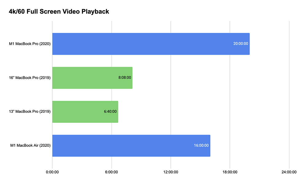 M1 맥북 제품군의 배터리 효율성이 정말 좋다고 이야기 할 수 있는데 단일 작업에서 비교해볼때 기존 인텔 맥 제품군 보다 몇배는 더 오래 사용할 수 있음을 알 수 있습니다.