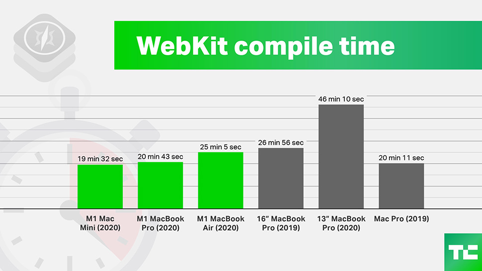 웹킷 컴파일 타임도 M1 칩을 탑재한 맥 제품군이 빠르지만 WebKit을 단일 빌드 한 후 M1 맥북프로에는 배터리의 91 %가 남아 있습니다.