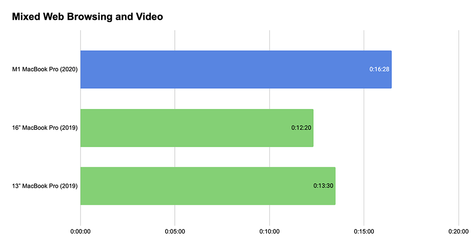 M1 맥북 제품군의 배터리 효율성이 정말 좋다고 이야기 할 수 있는데 단일 작업에서 비교해볼때 기존 인텔 맥 제품군 보다 몇배는 더 오래 사용할 수 있음을 알 수 있습니다.