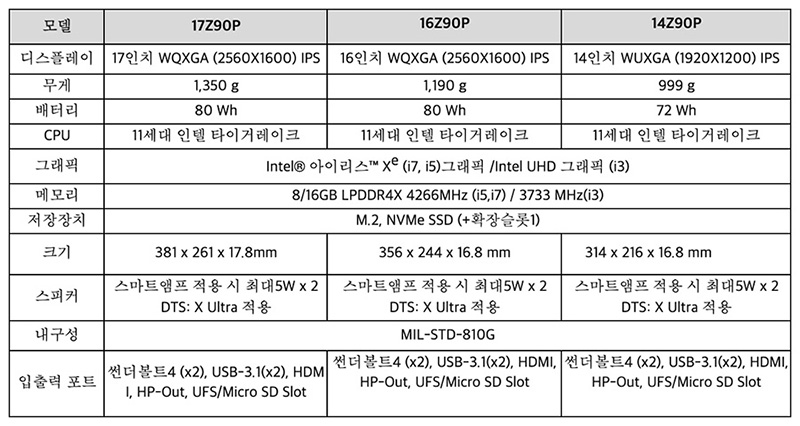 2021년형 그램 14/16/17의 스펙을 보면 아래와 같습니다.
