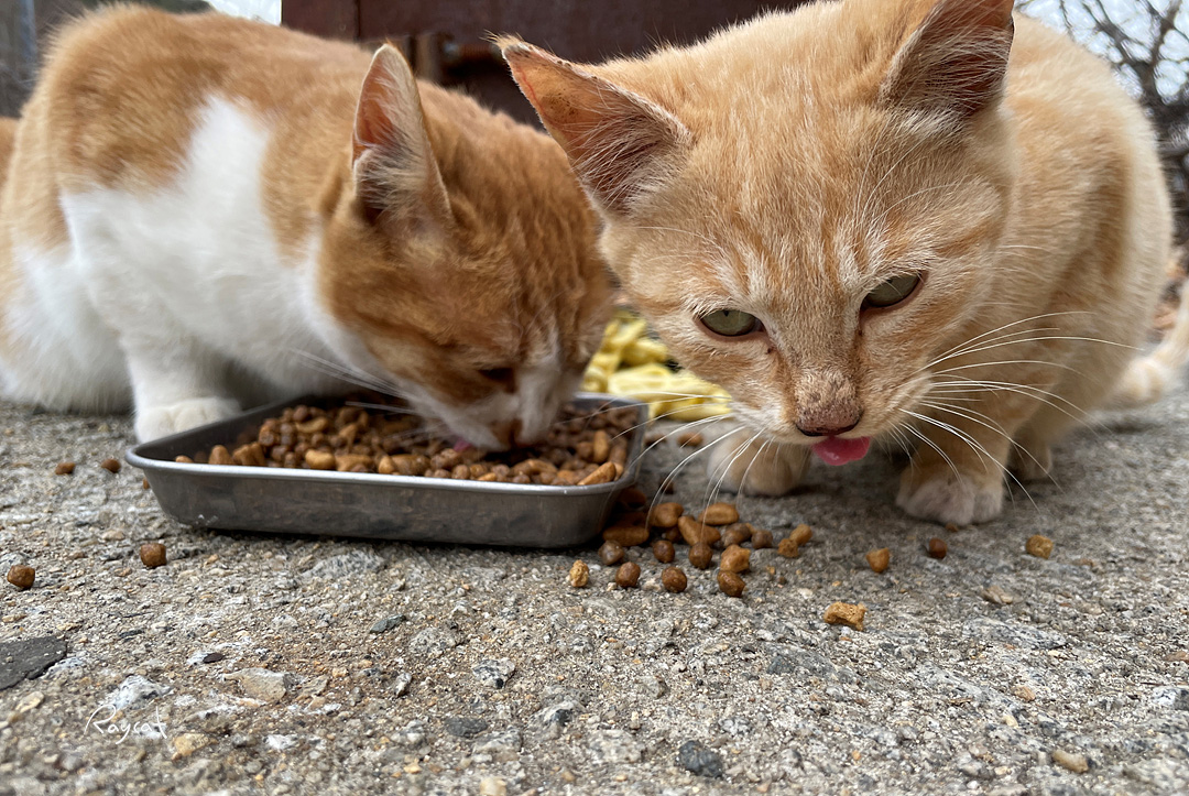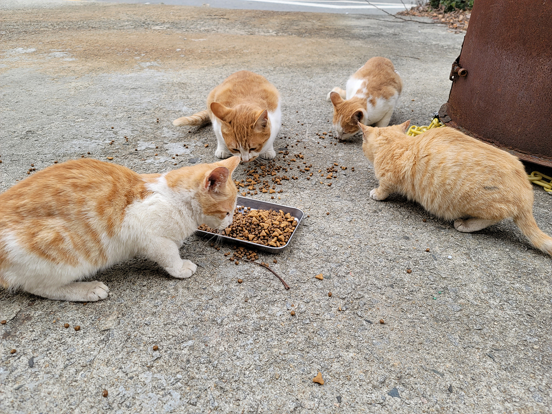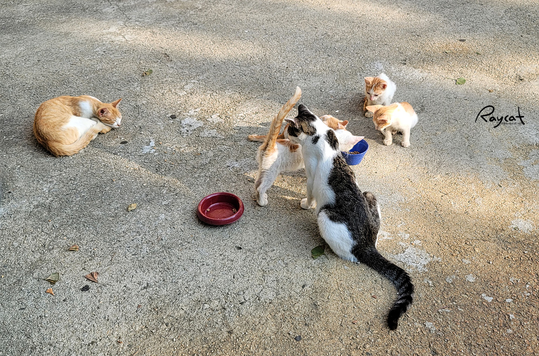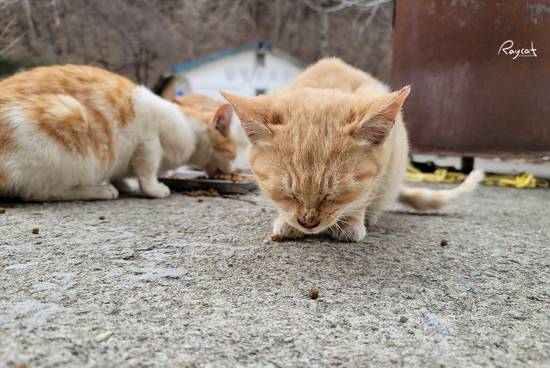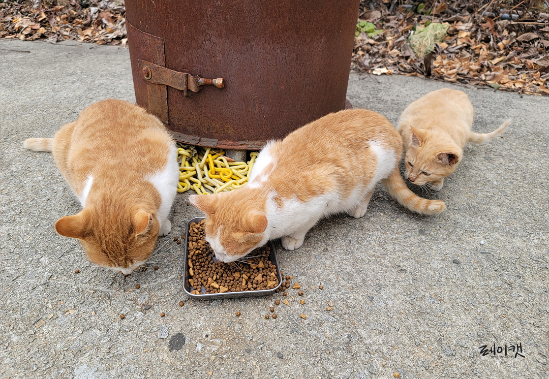 원래 이동네를 떠돌며 논밭을 돌아다니던 길고양이들이라 흔히 동네냥이라고도 하는데 삼색이 가족이 먼저 떠나고 지금은 치즈태비 가족중 일부와 다른 식구들 아기 고양이 하나가 자기 가족을 따라가지 않고 남았습니다.