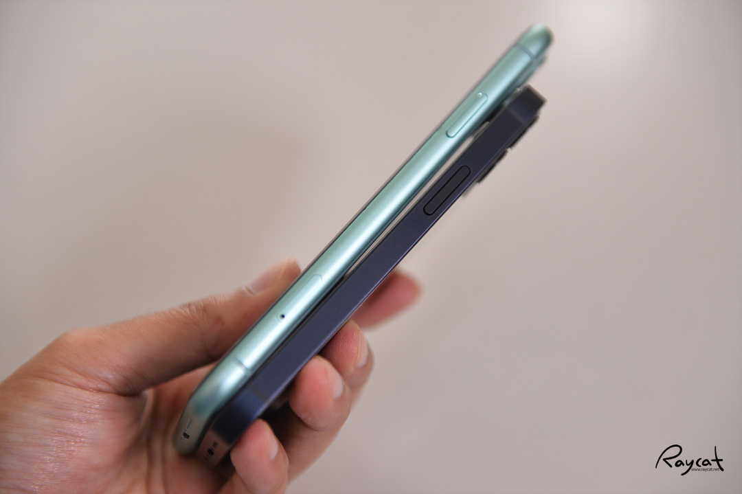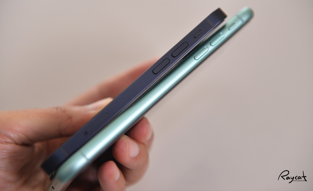 측면부를 보면 아이폰12 미니의 경우 이전에 출시한 아이폰4를 닮았는데 아이폰11의 경우 라운드진 형태로 손에 쥐었을 때 아이폰12 미니는 한 손에 쏙 들어오는 작은 크기로 그립감이 더 좋은 편입니다.