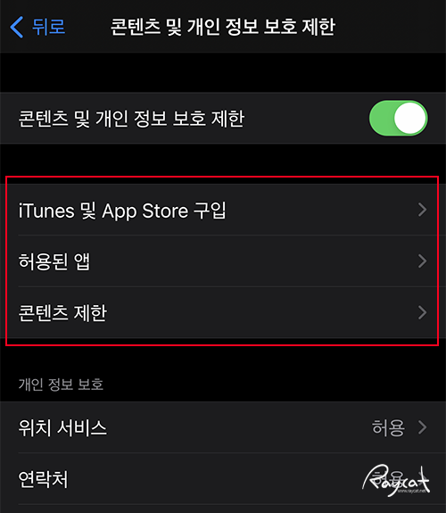 스크린 타임에서 콘텐츠 및 개인 정보 보호 제한에 보면 iTunes 및 App Store 구입 항목이 있는데 이곳에서 인앱 결제를 차단할 수 있으며 허용된 앱과 콘텐츠 제한 역시 설정 할 수 있습니다.