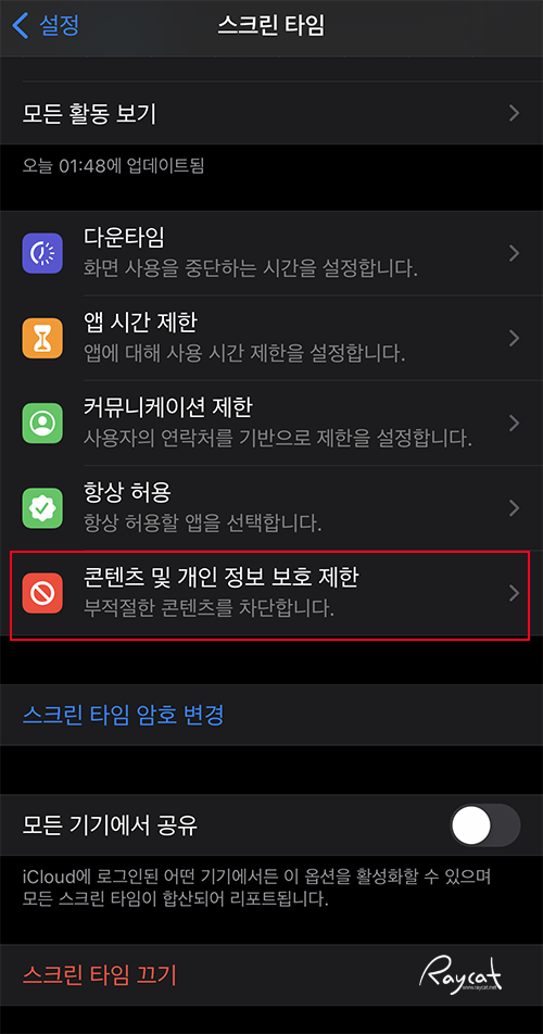 스크린 타임에 들어가 보면 다양한 기능이 있는데 스크린 타임에서 앱 사용을 제한 하거나 스마트폰 사용 시간을 제한 할 수 있는데 콘텐츠 및 개인 정보 보호 제한을 터치합니다.