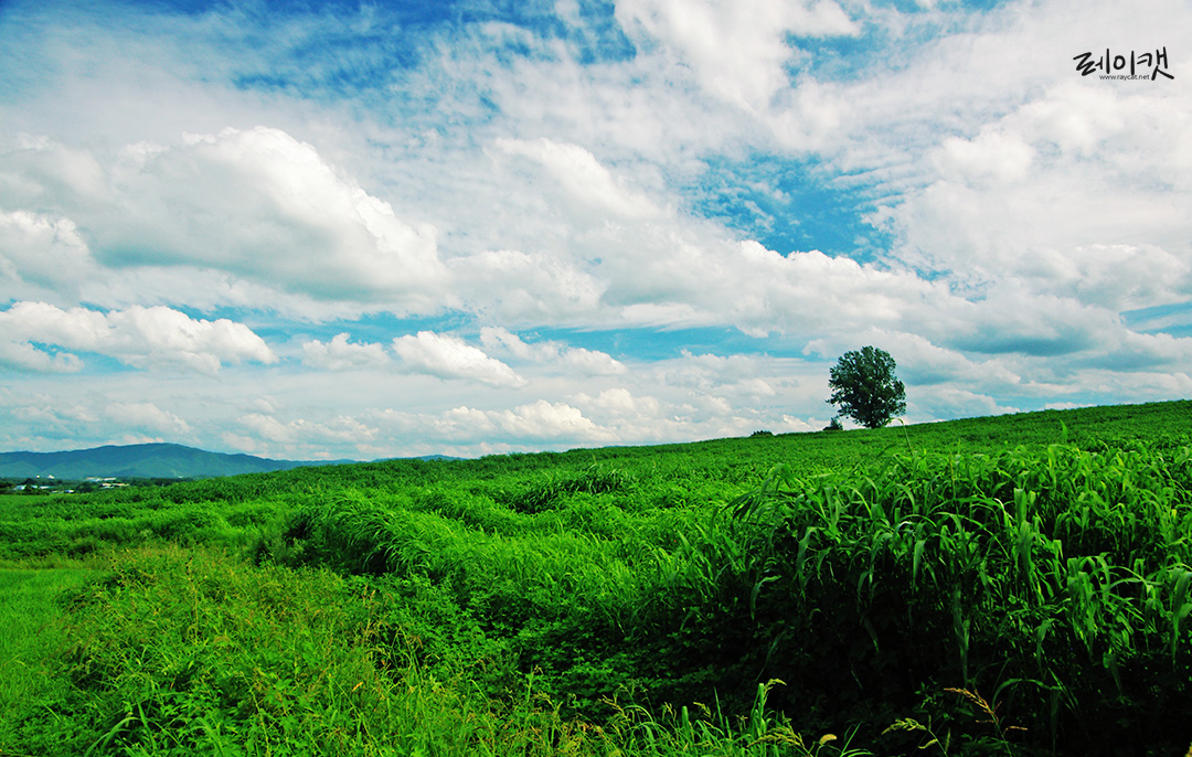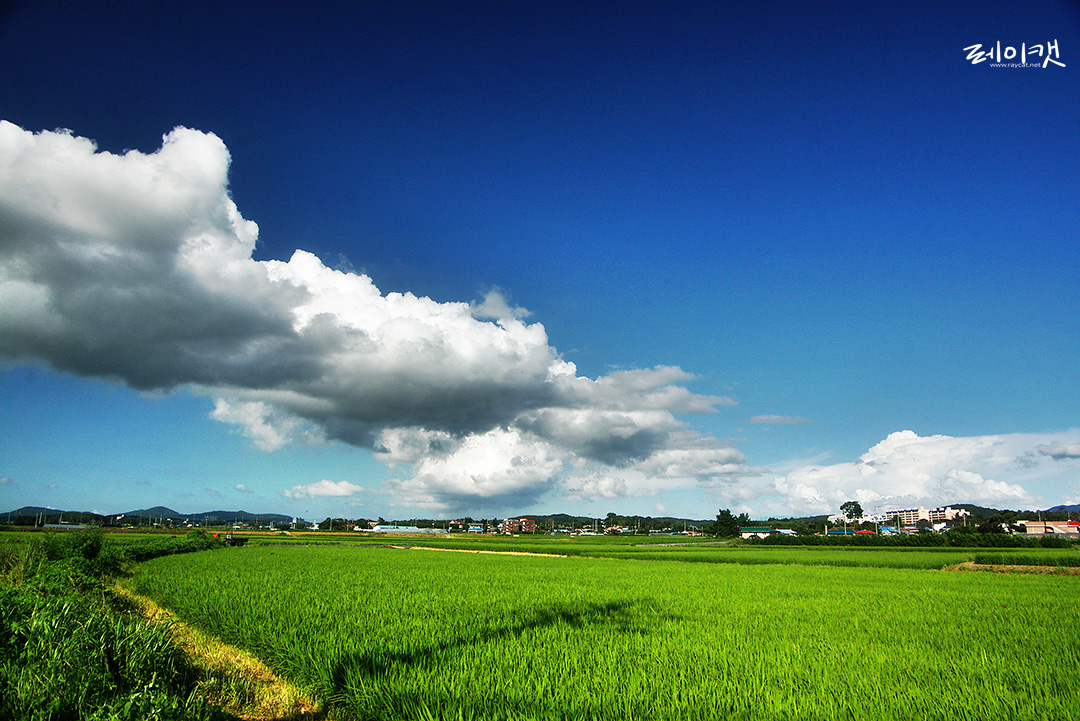 위 사진은 사선으로 가는 구름을 중심에 두고 논과 하늘을 반으로 나눈 이분할 구도 입니다.