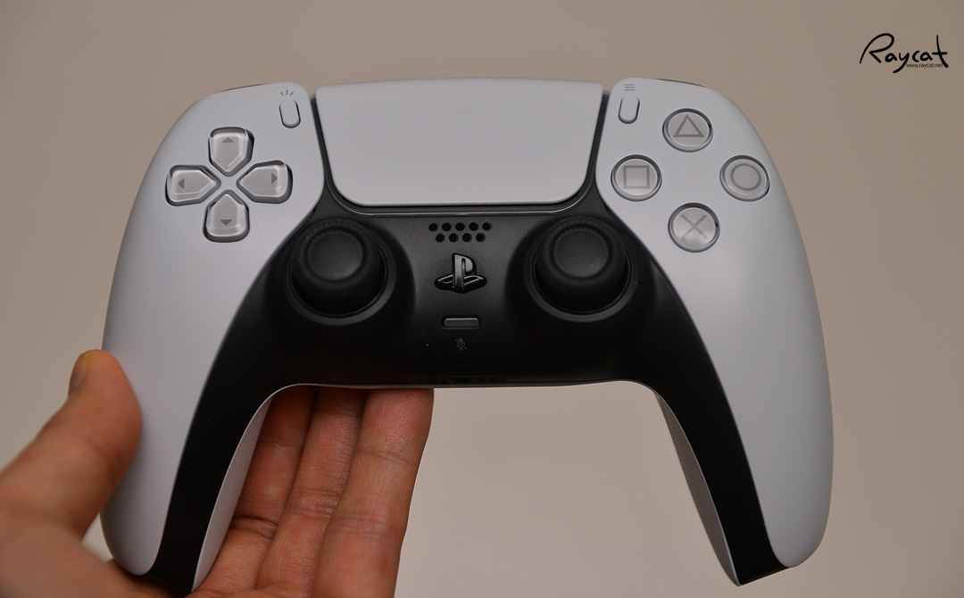 디자인이 이전 듀얼쇼크와 확실히 다른 느낌인데 기능키나 조작키, 터치 패드의 구성은 비슷합니다. 손에 쥐면 그립감은 이전 듀얼쇼크 보다 좀 더 괜찮게 느껴집니다. 중앙에 PS 버튼 위에 스피커가 있으며 바로 아래에 음소거 버튼이 있습니다.