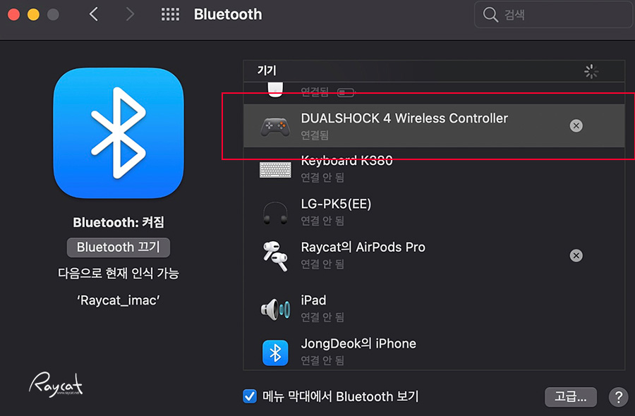 그러면 블루투스로 연결될 준비가 된것이라 보면 되는데 맥에서 블루투스 메뉴를 실행 검색하면 듀얼센스가 아닌 듀얼쇼크4 무선 컨트롤러가 나옵니다.