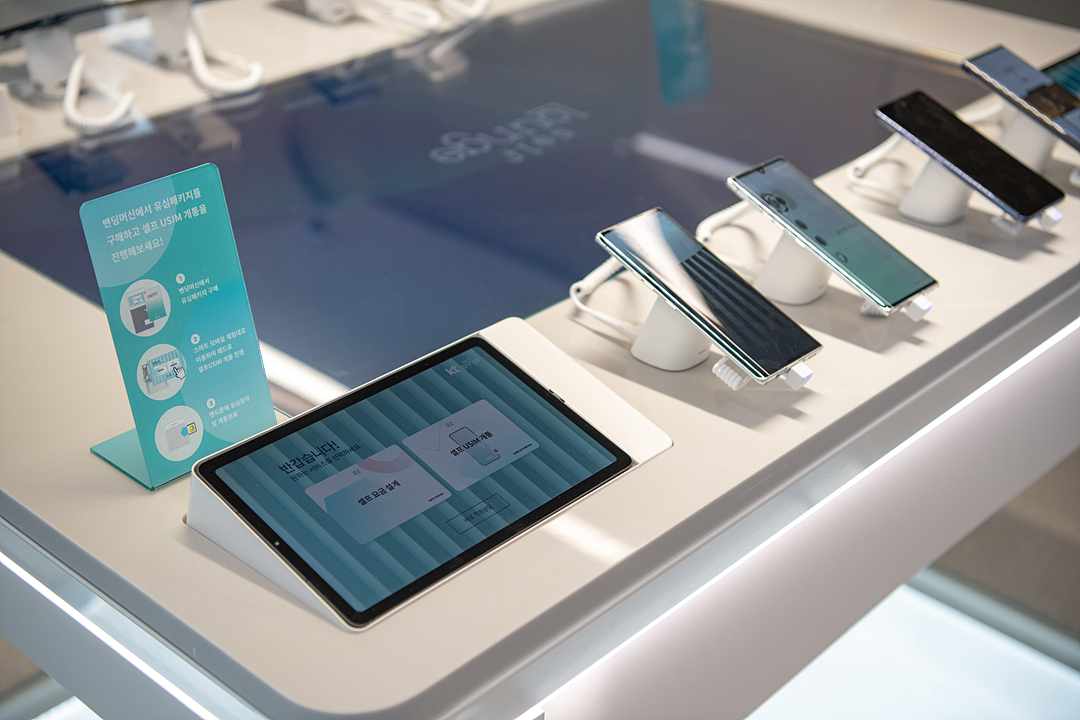 스마트폰체험대 : 다양한 최신 스마트폰 체험, 대형화면을 ㅌ오해 비교 후 패드를 이용한 셀프요금설계 및 USIM 개통 가능