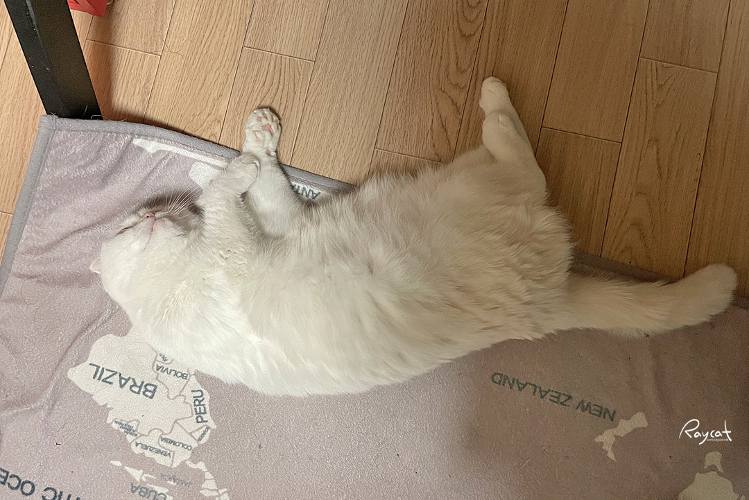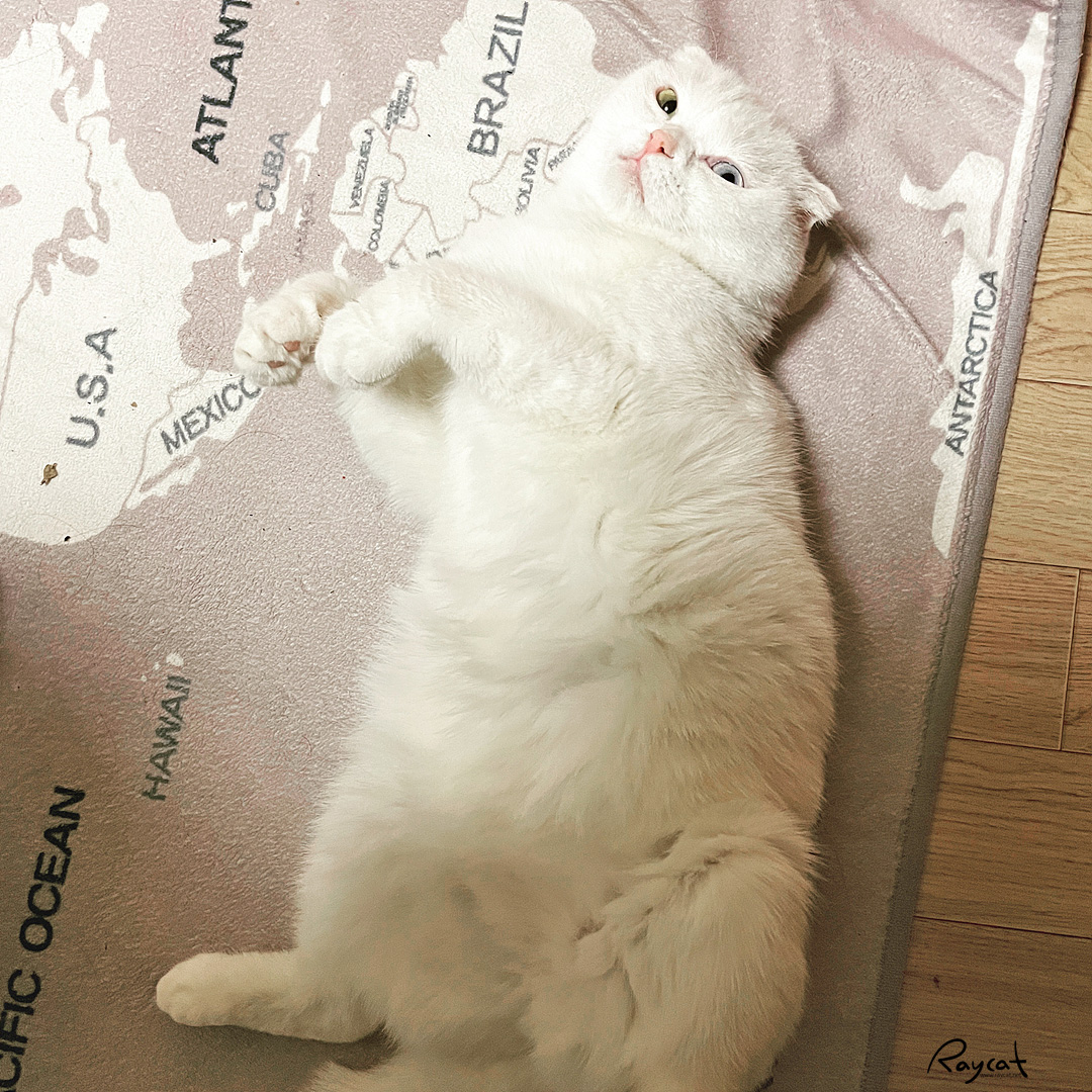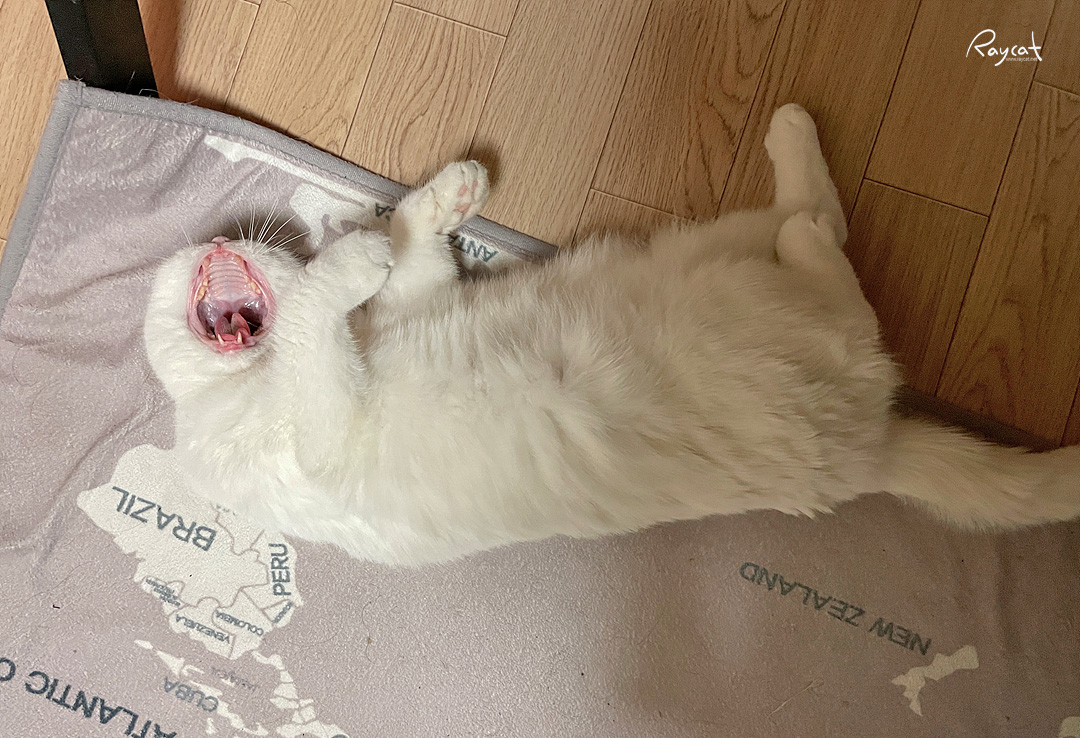 흔히 고양이가 기분 좋을때 하는 행동인데 배를 뒤집어서 보이며 놀아달라고 보채는 행동중 하나다.