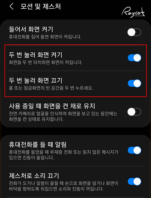 이 설정은 설정 -> 유용한 기능 -> 모션 및 제스처 -> 두 번 눌러 화면 끄기에서 설정할 수 있습니다. LG의 노크온 기능과 비슷한데 편해서 전 사용하고 있습니다.