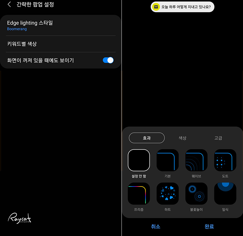 그리고 알림이 왔을때 화면의 모서리에 led 라이트가 들어오게 해서 사용했다면 기존과 다르게 설정 -> 알림 -> 간략히 보기 -> 간략한 팝업 설정 -> Edge lighting 스타일에서 설정할 수 있습니다.