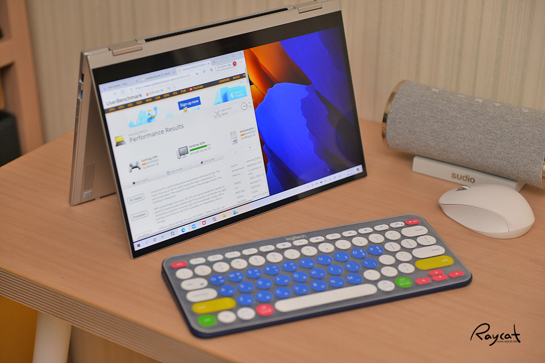 보통 노트북으로 활용할 경우 무릎에 놓고 사용할 때도 있는데 책상에 두고 사용할 때 위 사진처럼 블루투스 키보드와 마우스를 연결해 태블릿 모드로 사용하는 경우도 꽤 편합니다. 디스플레이는 QLED로 밝고 야외에서 사용해보면 시안성도 좋은 편입니다.