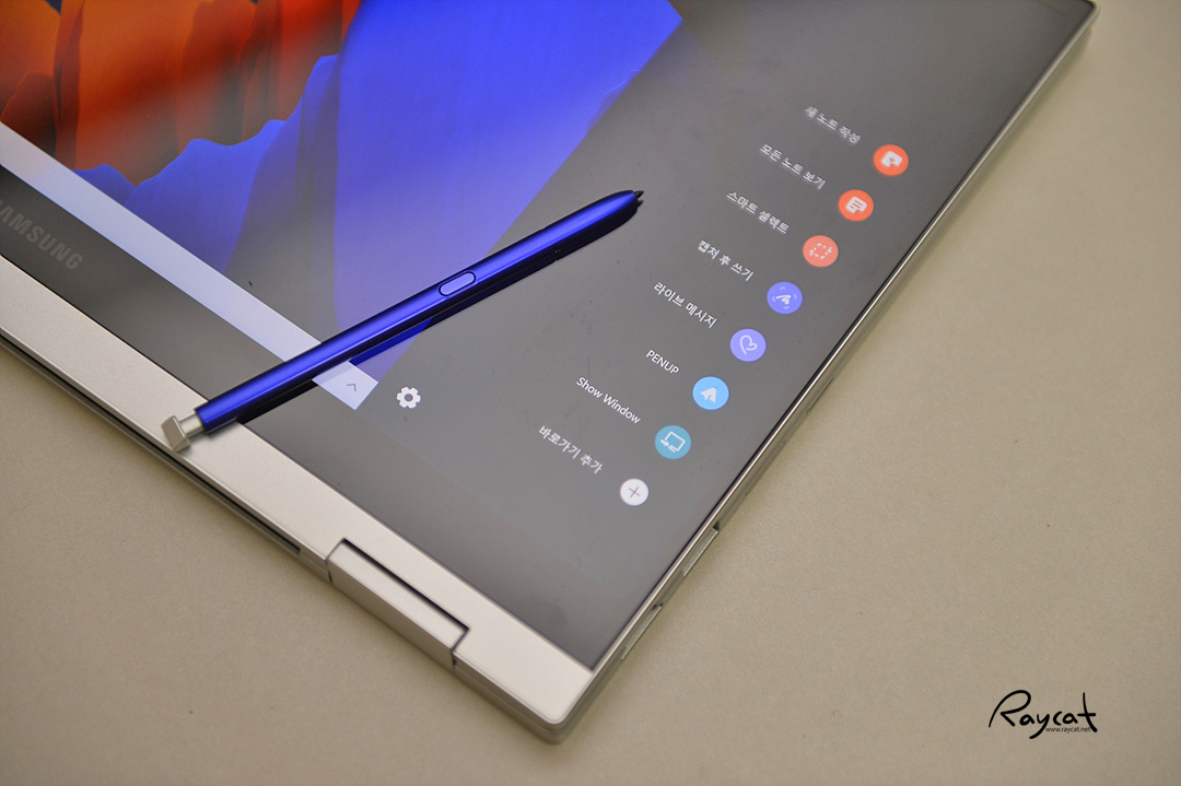 마치 노트북에서 갤럭시 노트의 S펜을 사용하는 느낌을 주는데 펜 기능에 제스처 기능도 지원하고 있으며 갤럭시 노트의 S펜 역시 갤럭시 북 플렉스2에서 사용할 수 있습니다. 갤럭시 노트의 S펜과 갤럭시북 플렉스2에 내장된 S펜을 비교해 보면 큰 차이가 없음을 느낄 수 있습니다.