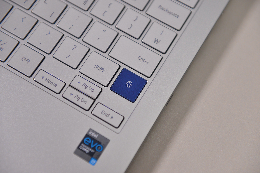 키보드의 키감도 괜찮은 편이며 전원 버튼이 측면에 있기 때문에 보통 키보드에 상단에 위치한 전원 버튼이 없으며 지문 인식 센서가 따로 있습니다. 지문 인식 센서는 꽤 편한데 윈도 로그인 시 손가락만 대면 바로 로그인이 되며 시작합니다.