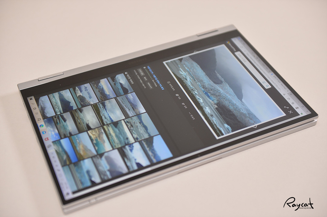 태블릿 모드를 위해 힌지는 360도로 회전하기 때문에 이렇게 펼쳐서 사용하거나 접어서 사용할 수 있는데 디스플레이를 회전하면 화면은 자동으로 회전합니다.